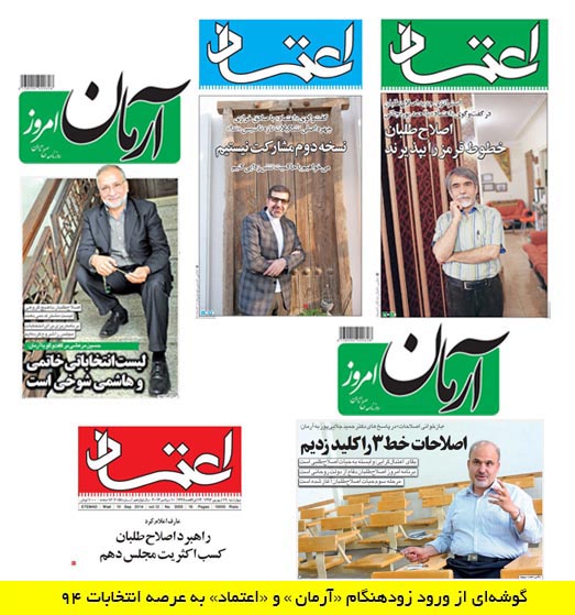 تصویر زیر گوشهای از این اقدامات را که در هفتهی اخیر در دو روزنامهی «اعتماد» و «آرمان امروز» وابسته به جناح اصلاحطلبی سنتی و نو اصلاحطلبی منتشر شده است، نشان میدهد.